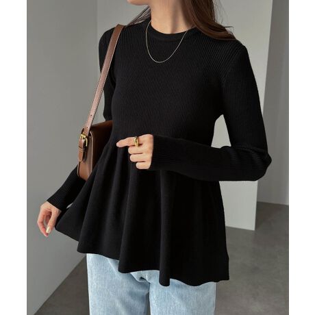 無地 ボーダー ペプラム フレア リブ ニット トップス