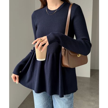 無地 ボーダー ペプラム フレア リブ ニット トップス