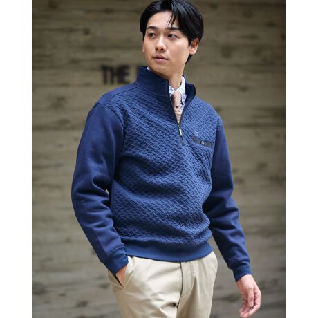 ハーフZIP仕様のスウェットです。前身頃はフクレジャカードで幾何学柄を立体的に表現しました。後身頃、袖は鹿の子調のダンボールニット生地を使用しています。様々なコーディネートに着合わせしやすいスウェットです。