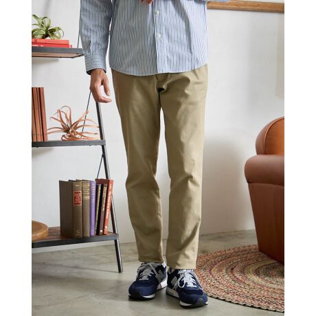 適度なストレッチ性のあるチノパンです。シルエットはテーパードのスリムフィット。ノータックですっきりとした印象です。どのアイテムにも合わせやすいベーシックなカジュアルアイテムです。