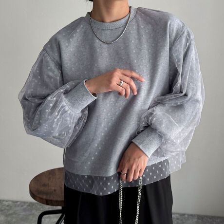 大人可愛い着こなしが叶うドットチュールレイヤードスウェット