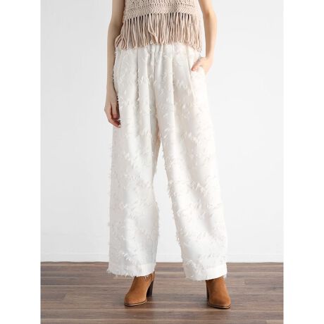 レトロなフラワー柄ジャガード×フリンジ素材が華やかなイージーパンツ。