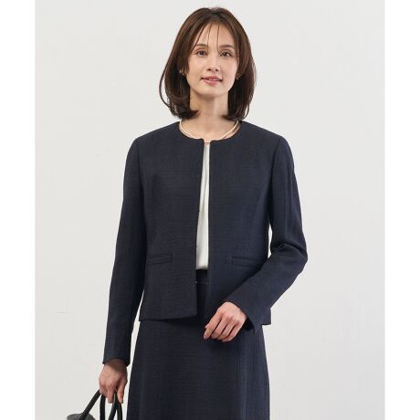 すっきりとしたシルエットで着回しやすいノーカラージャケット。襟まわりと前端部分にテープを挟み込むことでアクセントにしています。同素材のスカートと合わせた際に、バランス良く着られるよう着丈にもこだわりました。スカートとセットアップでも単品でもお使いいただける汎用性の高いアイテム。袖口にベントを入れてることで袖を折り返すこともでき、季節やインナーに合わせてお好みの袖丈に調節していただけます。総裏ありです。