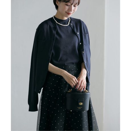 カーディガンは飾りポケットとシルバーのボタンがアクセントに。