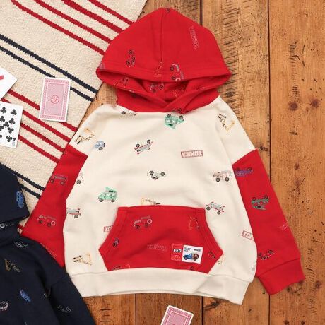 はたらく車や「TOMICA」のロゴの総柄刺繍がとってもかわいいパーカー★前ポケットにはTOMICAのパッケージデザインのオリジナルラベルがついています♪オリジナルラベルにはFOスマイルも登場しているよ!イメージを変えて着られる2色展開。きょうだいでリンクコーデもおすすめです♪