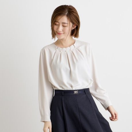 衿元の立体的なタックとパール調のパーツがポイントの1枚で華やかなきれいめブラウスです。