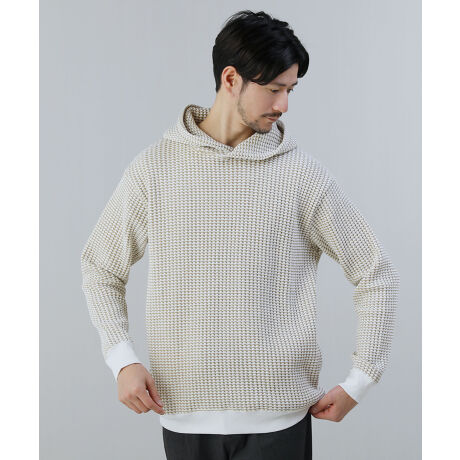 ぽこぽことした立体的な編地が特長的なワッフルニット。2色の糸で編み上げ、細かいチェック柄のような模様を作り出しました。