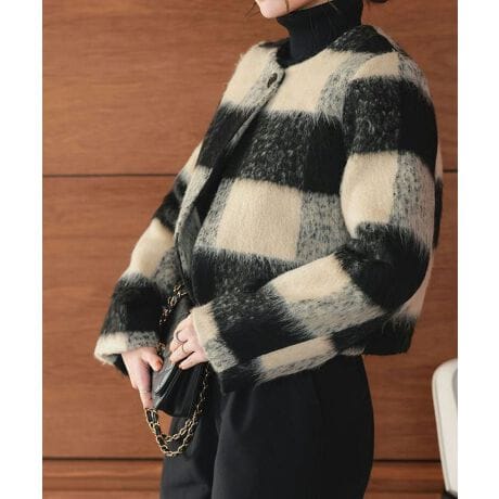 ふんわりとした温かみのある表情のシャギー素材。コンパクトなフォルムがかわいく、フロントの一つボタンもアクセント。さっと羽織るだけでおしゃれさをぐっと上げてくれるトレンドジャケットは無地とクラシカルなチェック柄の2typeデザインでご用意しました◎