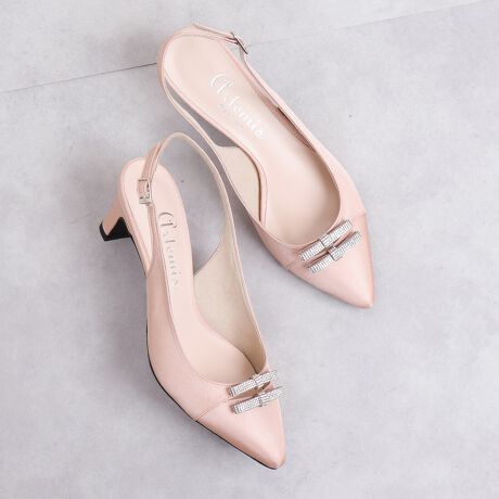 ・ラインストーンのミニリボンを2つ並べた、華やかなシーンでも活躍するバックバンドパンプス。