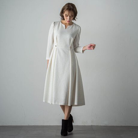 上品なラメの輝きがあり華やかな印象です。キーネックにすることで抜け感をプラス。