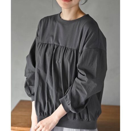 胸元はギャザーをあしらってふっくら女性らしいシルエットに。