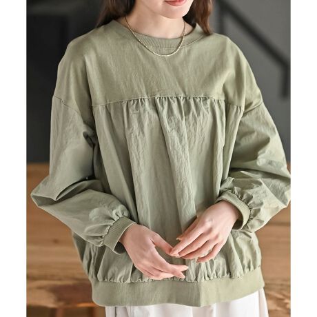胸元はギャザーをあしらってふっくら女性らしいシルエットに。