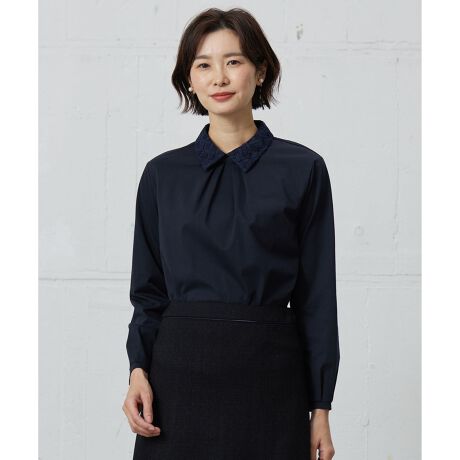 レースを施した襟が華やかな印象の、ブラウス代わりに着て頂けるカットソー。襟元のタックも立体感があり、ジャケットを羽織った際のアクセントになります。襟の後ろはコンシールファスナー仕様となっており、着脱しやすいのも嬉しいポイント。1枚でも、ジャケットのインナーとしてもシーンレスに活躍する汎用アイテムです。