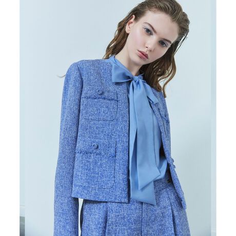 ミストのように細かい織りのツイードのノーカラージャケット。