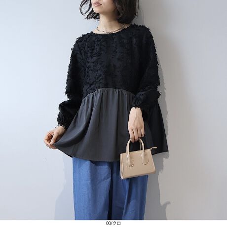 ふわふわとした表面感の素材とトロンとした落ち感のある布帛の異素材使いのチュニックブラウスです。