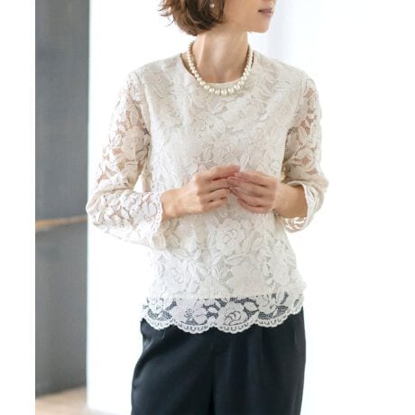 程よい透け感のある上品な花柄レースを使用しスカラップを生かした華やかな総レースブラウス。