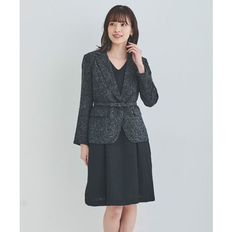 ジャケットと共布リボンベルトでウエストを絞るとより一層スタイルアップが期待できます。