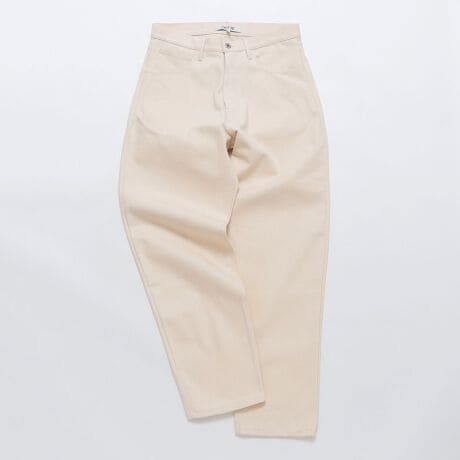 YKKのタックボタン留め、YKKのエクセラジップをフライに配している。ヘビーコットンツイルのポケットが耐久性を向上。ふくらはぎ下は緩やかなテーパードでリラックスフィットのパンツ。後部に裏地付きの大きなパッチポケット2つ。