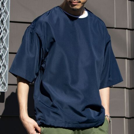 さらには裾にドローコードが付き、シルエットの変化も出せる、見た目はシックですが機能的な面も魅せるTシャツです。