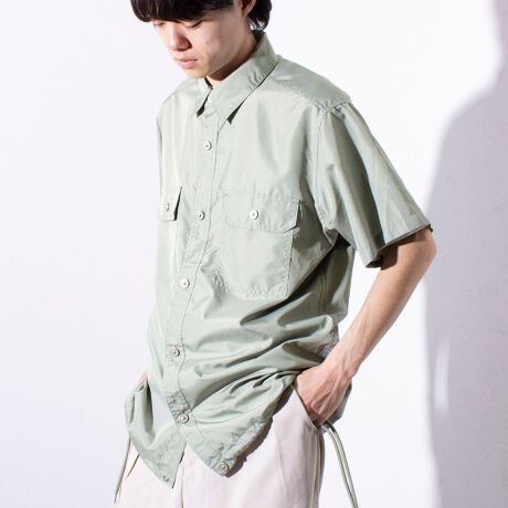 両裾脇から見える紐が特徴のミリタリー半袖シャツ