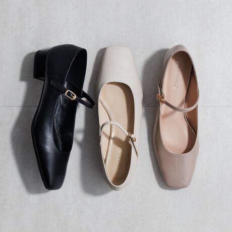 今っぽさ漂うクラシカルなスクエアトゥのメリージェーンパンプス。