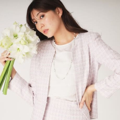 ラメ糸やテープヤーンなど意匠糸を使用した華やかなファンシーツィードジャケットです。