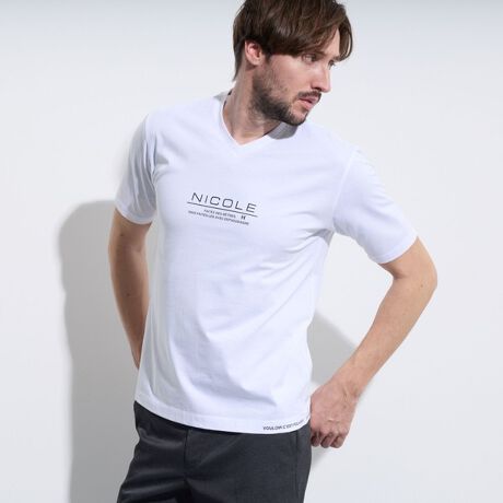 プリントは前面にNICOLEロゴ、前後の裾にロゴプリントを施した、スッキリと見える上品なVネックTシャツに仕上げています。