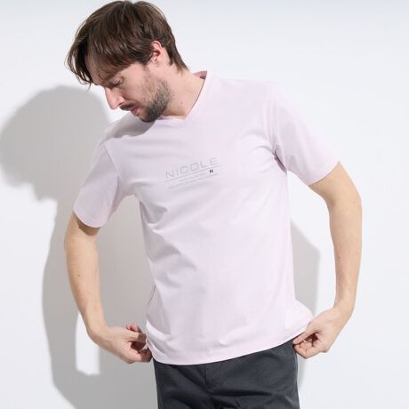 プリントは前面にNICOLEロゴ、前後の裾にロゴプリントを施した、スッキリと見える上品なVネックTシャツに仕上げています。