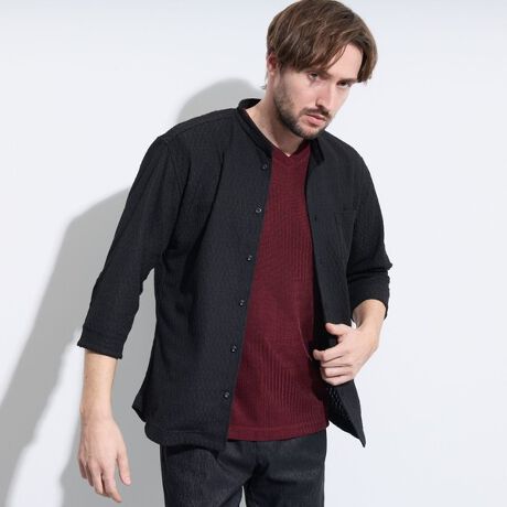 バーク風ジャガード7分袖バンドカラーシャツ