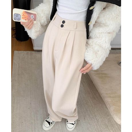 【Banico】 ■デザイン *落ち感が綺麗なストレートデザイン。程よいルーズシルエットとタックデザインが、ボディラインを拾わずすっきりとした着こなしに。後ろのウエストはゴムになっているため、ストレスフリーな履き心地です。