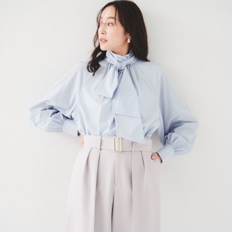 取り外しのボウタイが付いたブラウスは、身頃と袖にたっぷりとギャザーを施したデザイン。
