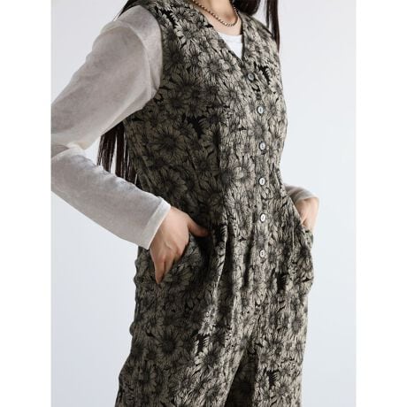 フラワーモチーフのジャガード生地が上品見えするオールインワン。