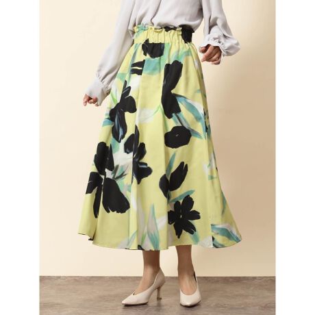 水彩絵の具でペイントしたような、ニュアンス感あるフラワーモチーフのフレアスカート。
