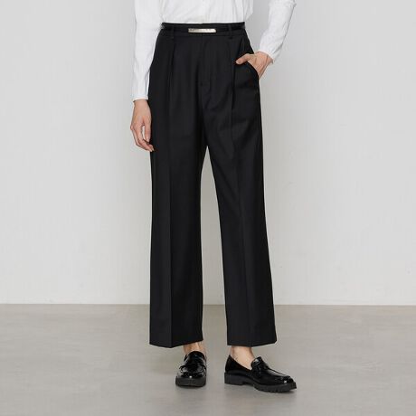 脇高のタックでボリューム感は出しつつ、ウエスト周りは薄く見せると共にタックから続くセンタープレスで、たてのラインを作り脚長効果が期待できます。