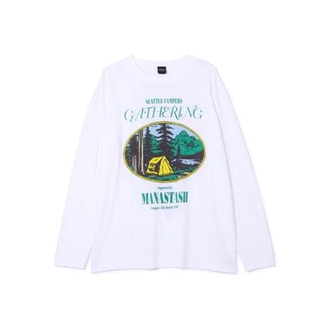 MANASTASH/マナスタッシュ/ L/S TEE CAMPERS GATHERING/ロングスリーブTシャツ キャンパーズギャザリング・5.6オンスの生地を使ったTシャツ・ヴィンテージのキャンプ場のTシャツをオマージュしたグラフィック・グラフィック=【LAIDBUG(木内俊文)】【MANASTASH/マナスタッシュ】1993年に米国シアトルで設立された<MANASTASH>。ブランド名の由来となる北アメリカ大陸の西海岸沿いを南北に走るカスケード山脈から駆け落ちるマナスタッシュ山高原は、スキーやトレッキング、マウンテンバイク、ラフティング、カヤックなど多様なアウトドアスポーツが楽しめることで有名です。創業時よりヘンプやリサイクルフリースなど環境に優しい素材を採用して最高のアイテムを作ることを理念に掲げ、旧き良きアメリカのプロダクトをデザインベースにしたライフスタイルブランドは、ファッションとカルチャーをクロスオーバーさせた新しいスタイルを提案します。