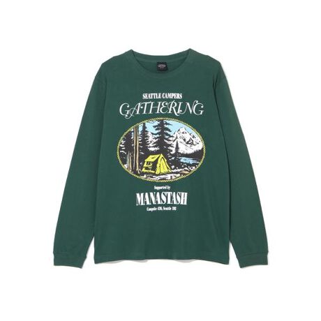 MANASTASH/マナスタッシュ/ L/S TEE CAMPERS GATHERING/ロングスリーブTシャツ キャンパーズギャザリング・5.6オンスの生地を使ったTシャツ・ヴィンテージのキャンプ場のTシャツをオマージュしたグラフィック・グラフィック=【LAIDBUG(木内俊文)】【MANASTASH/マナスタッシュ】1993年に米国シアトルで設立された<MANASTASH>。ブランド名の由来となる北アメリカ大陸の西海岸沿いを南北に走るカスケード山脈から駆け落ちるマナスタッシュ山高原は、スキーやトレッキング、マウンテンバイク、ラフティング、カヤックなど多様なアウトドアスポーツが楽しめることで有名です。創業時よりヘンプやリサイクルフリースなど環境に優しい素材を採用して最高のアイテムを作ることを理念に掲げ、旧き良きアメリカのプロダクトをデザインベースにしたライフスタイルブランドは、ファッションとカルチャーをクロスオーバーさせた新しいスタイルを提案します。