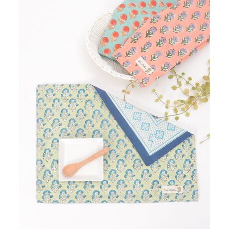 [型番:30660310]華やかなボタニカル柄のインド製ランチマット。表と裏、リバーシブルで使えるのがうれしい!【デザイン】インドのブロックプリントでデザインされたボタニカル柄のランチマット。【ポイント】表裏で雰囲気が変わる!心ときめく配色と素朴な花柄で、テーブルの上がお花畑のように華やぎます。