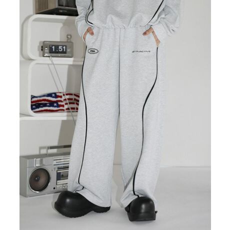 パイピングのデザインがスポーティな印象のスウェットパンツ。リラックス感のあるオーバーサイズのシルエットで、動きやすさと快適さを兼ね備えたパンツです。ウエストはゴム&紐になっており、軽い穿き心地で通年で着用できます。裾にはドローコードが付いているため、お好みで丈の長さを調節することが可能。フロントにはロゴの刺繍が施しており、アクセントになります。レディース、メンズ問わず着用いただけます。