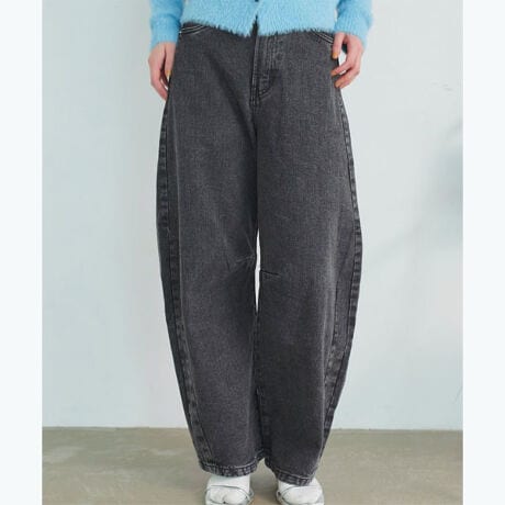 名前通りカーブが美しいデニムで一目で気に入ったのですがデザイン上ウエストが細くて試着の範囲で着続いていたら苦しくてギブ泣く泣く諦めました。ちなみにウエストはゴムで伸縮性あり。あたしはwが太く67cm体型は157cmで丈はつま先が隠れる程度でいい感じでした。カーブとワイドシルエットを見事に提供しているのでそう言うラインをお求めなら絶対オススメです。