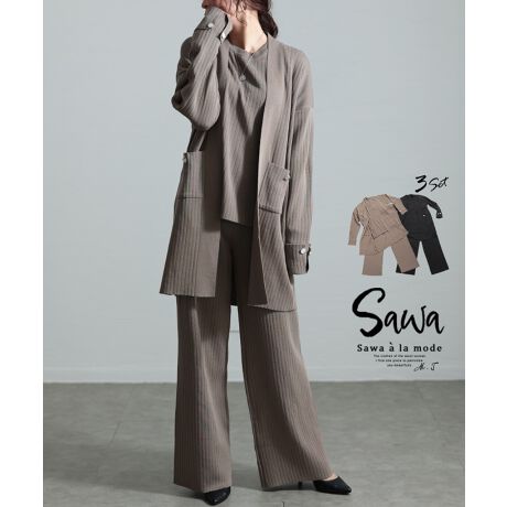【セットアップ】 トップス カットソー カーディガン パンツ ワイド ニット リブ 黒 グレージュ
