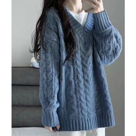 寒い季節にぴったりな、暖かみのあるVネックのケーブル編みニットトップス。