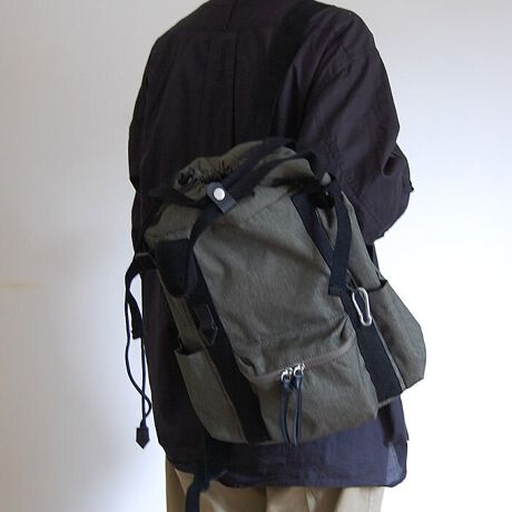 など機能的なパーツが付いた巾着タイプのリュックです。