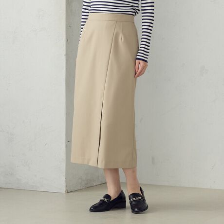 ラップ風のディテールがデザインポイントの、Iラインシルエットスカート。