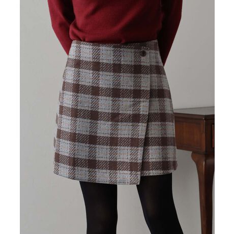 ミニ丈とチェック柄でカジュアル感を加え、ラップスカート風のデザインでおしゃれなポイントをプラス。