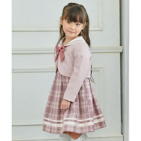 セーラージャケット+チェックワンピースの2点セットで完成する、制服風スタイリング。ワンピースは背中ファスナー仕様なので、お着替えも楽々!胸元のリボンはスナップボタンになっており、取り外し可能なのでシーンに合わせて着用できます。ジャケットのセーラー部分にあしらわれたレースもポイント♪カラーは、セレモニーらしい上品な印象のネイビー(#075)と、柔らかい雰囲気で甘さをプラスできるピンクベージュ(#030)の2色展開。ワンピースは右ポケット付きで、ハンカチやティッシュなどを入れられるのも、嬉しいポイント。卒園式・入学式など、ハレの日に重宝すること間違いなしの一着です。