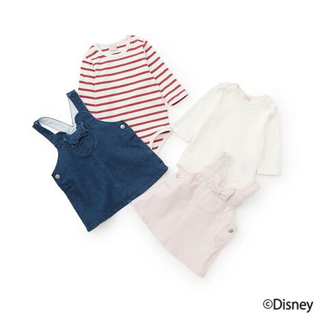 ミニーマウスのデザインがアイキャッチなジャンスカとロンパースのセットです。<br>モチーフを中央に飾ることで可愛らしい印象に仕上がりました。<br>ジャンスカは身頃サイドにスナップボタンを備えており、お着替えに便利な工夫をプラス。<br>それぞれ単品でも楽しめるため、着こなしの幅も広がります。<br><br>【おすすめの着用時期は秋冬シーズン】<br><br>【透け感】透けない<br>【生地の厚さ】普通<br>【伸縮性】あり<br>【裏地】なし<br>【ポケット】あり<br><br>◎キッズサイズとお揃いが叶います<br>品番:9643117<br>商品名:【Disney】耳つきジャンスカ<br>サイズ:S-L