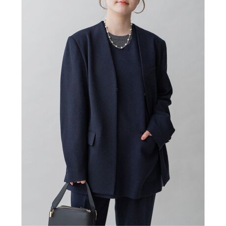 ミニマルなデザインのノーカラージャケット。