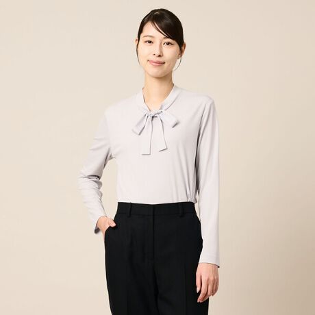 ソフトでスムースな肌触りの生地で仕立てた、着心地抜群の長袖カットソー。フロントのボウタイがスタイリッシュなデザインアクセント。オン・オフ問わず着こなせる、きちんと感のあるエレガントなデザインが魅力です。お手持ちのボトムに合わせるだけで、シックなお出かけコーディネートが完成します。