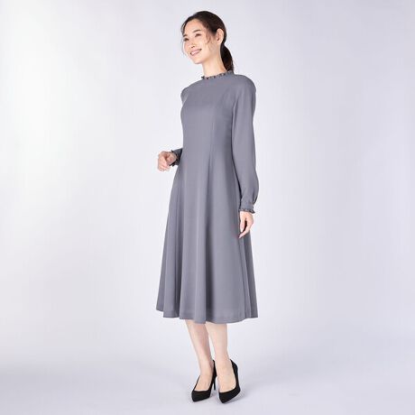 シフォンクレープ生地で仕立てた長袖ワンピース。首周りと袖口のフリルのあしらいがロマンチックなムード。立体感のある美しいシルエットと適度にドレープ感のある膝下丈スカートがフェミニンなデザイン。ブラウスのような袖のくるみボタンがエレガントなデザインポイント。一枚でお出かけスタイリングが実現します。