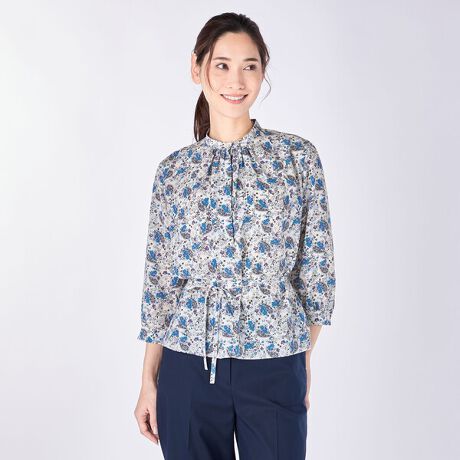 ペーズリーとフラワーモチーフを組み合わせたプリント7分袖ブラウス。ギャザーの入ったスタンドカラーがフェミニンなデザインポイント。ウエスト位置をマークし、メリハリあるシルエットを演出するウエストリボン紐付き。お手持ちのボトムに合わせて、華やかなお出かけコーディネートが完成するアイテムです。